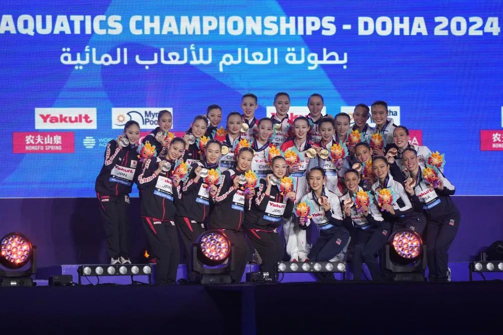 2月9日,冠军中国队(中)、亚军日本队(左)和季军美国队在颁奖仪式上。当日,在卡塔尔多哈举行的2024年世界游泳锦标赛花样游泳集体自由自选决赛中,中国队夺得冠军。新华社记者 薛宇舸 摄