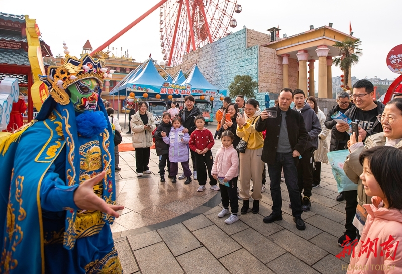2月12日,游客在长沙世界之窗龙福主题庙会上欣赏变脸表演。