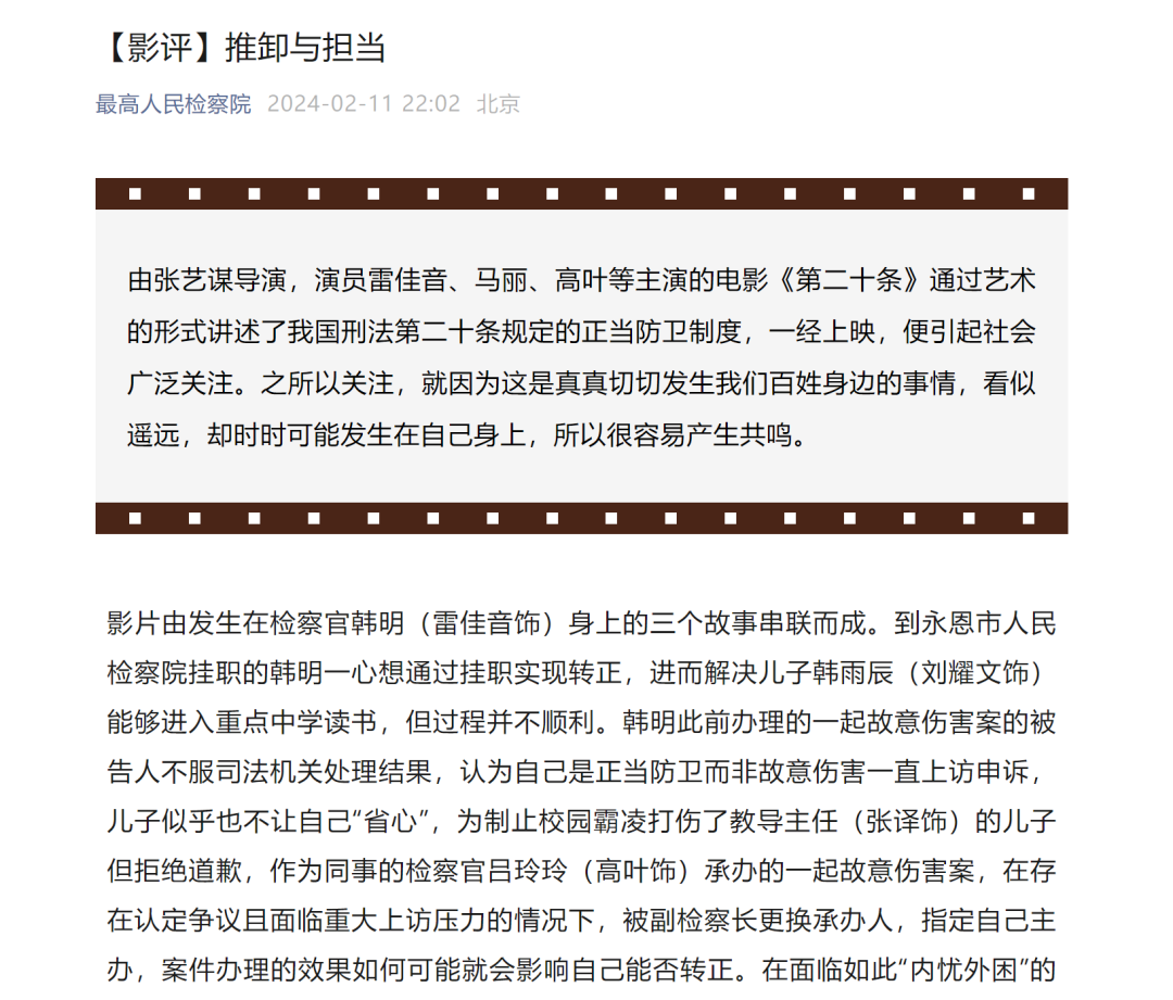 2月11日,最高检发布署名为纪丙学(最高检第一检察厅)的影评《推卸与担当》。
