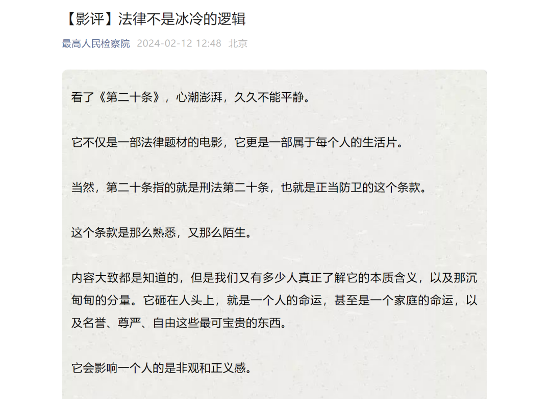 2月12日,最高检又发布署名为北京市人民检察院第一检察部副主任、三级高级检察官刘哲的影评《法律不是冰冷的逻辑》。