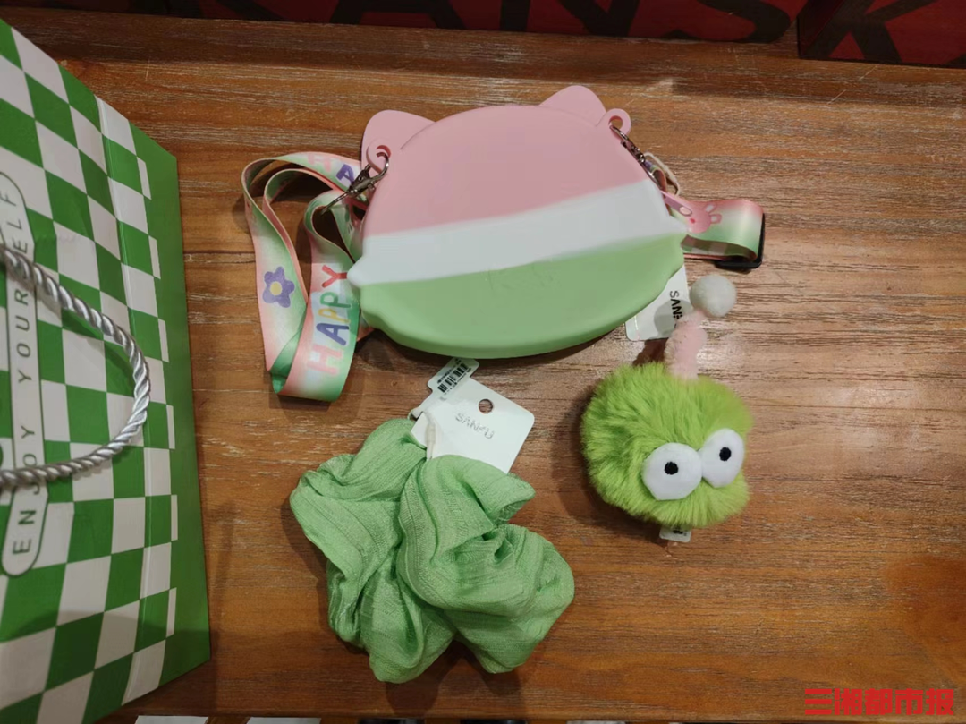收银员提供的小票上写着,盲袋内含“泡泡棒—弹弓1件、群星闪耀三方油漏1件、串珠—环扣手机链1件”,而记者从盲袋中拆出的是怪诞大眼毛球(绿球)、多巴胺色彩圈(绿)、趣味卡通系列双用包花猫各一件,显示商品总价值为52.9元。