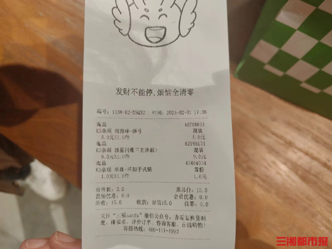 日前,三湘都市报记者前往位于长沙开福万达广场的三福时尚,买到一个售价为15元的盲袋。