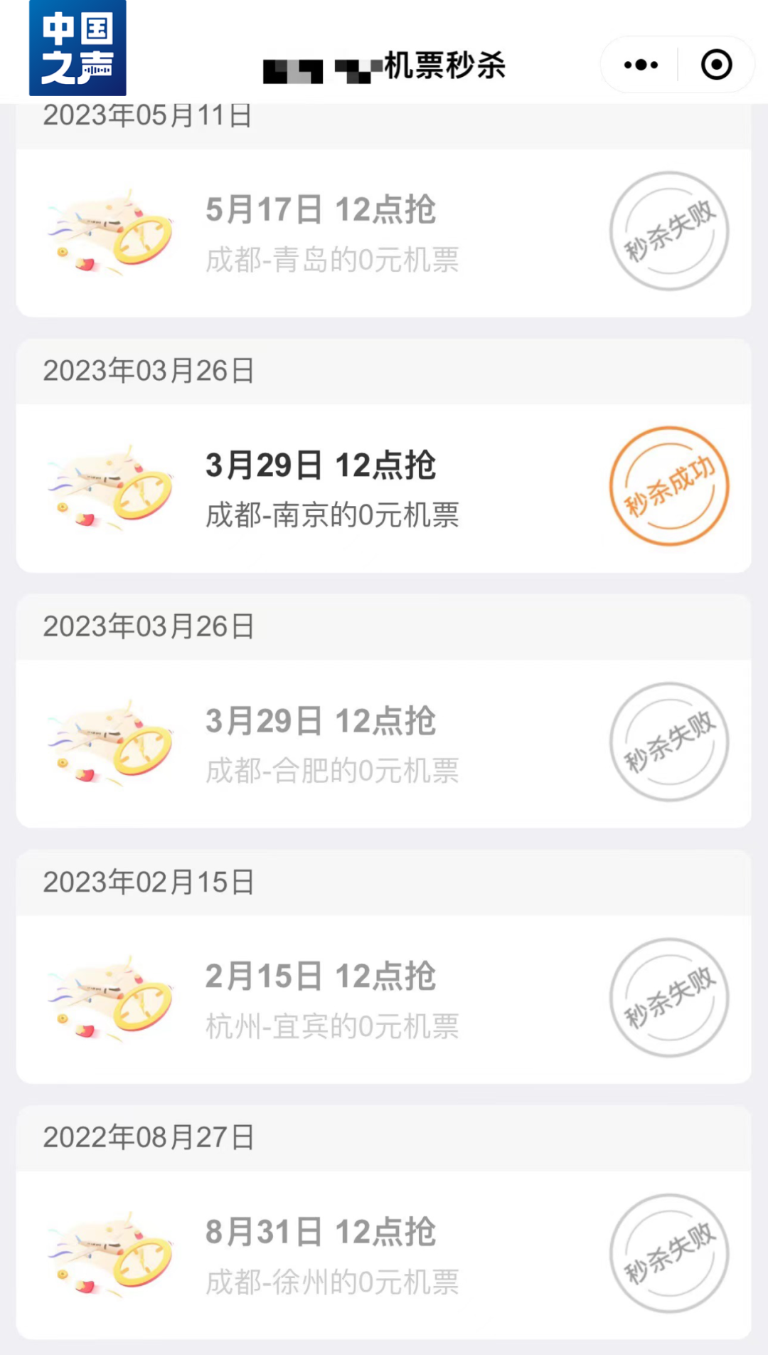 唐女士表示,本来她要从成都去往徐州,但机票的目的地并没有徐州这一选项,只能改到南京,下飞机后又迂回返程。此后,她又参加过多次“0元机票”的秒杀活动,再没成功过。