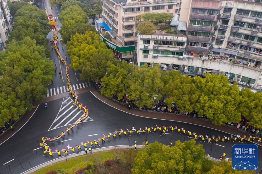 ↑2月24日,民俗踩街队伍在浙江诸暨街头进行踩街巡游(无人机照片)。新华社记者 徐昱 摄