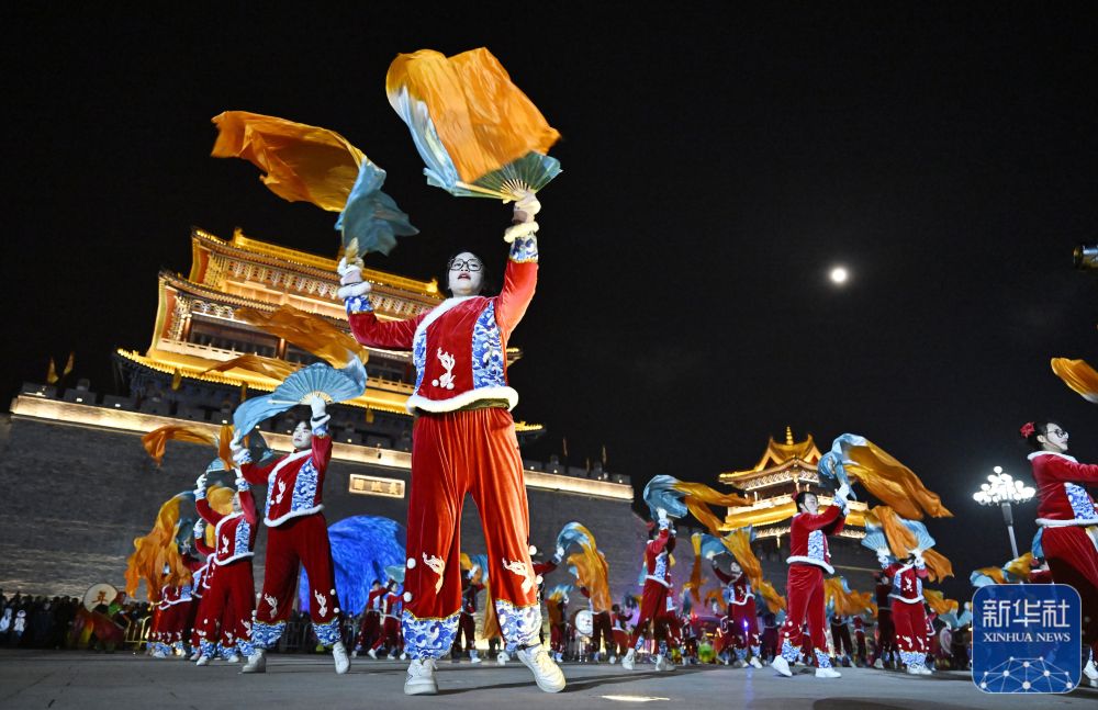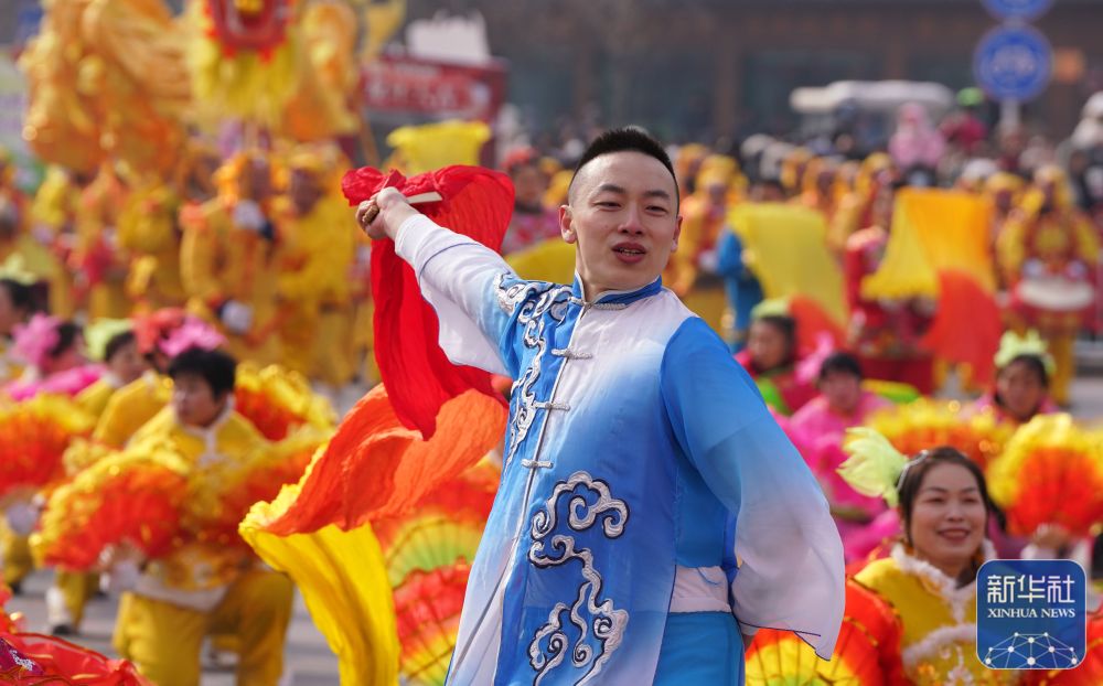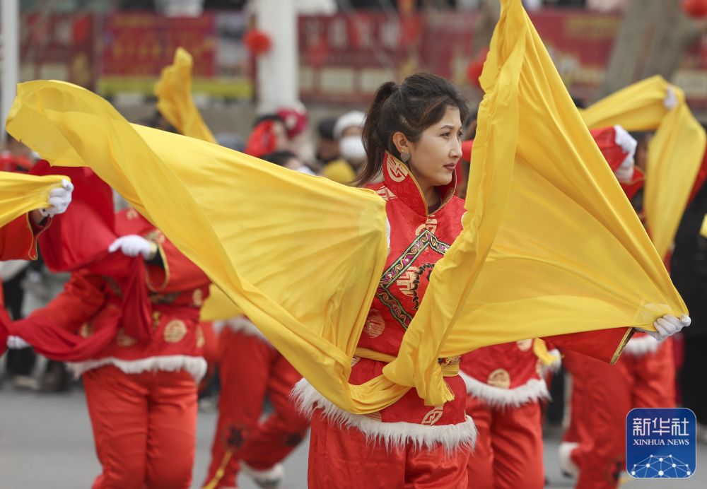 ↑2月24日,在新疆昌吉市,社火队员进行扇子舞表演。新华社记者 张啸诚 摄