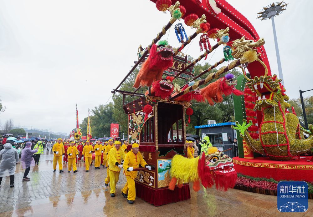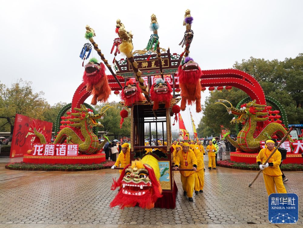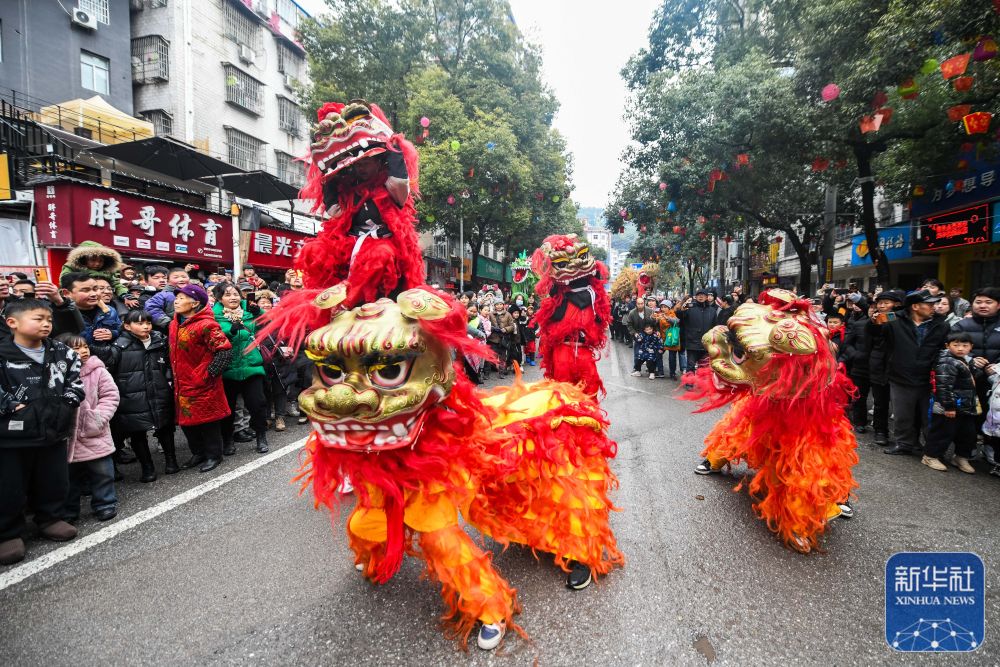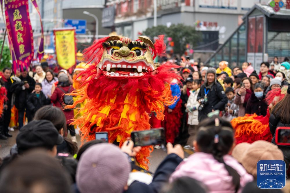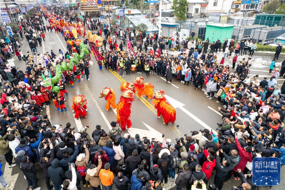 ↑2月24日,参加踩街表演的抖狮子民俗表演队在浙江诸暨街头演出。新华社记者 徐昱 摄