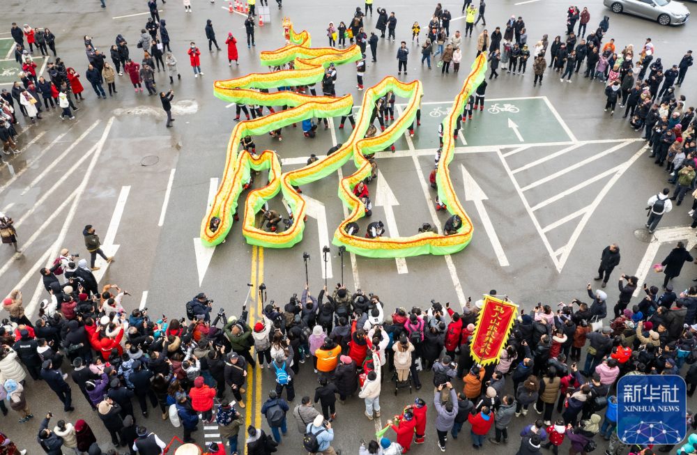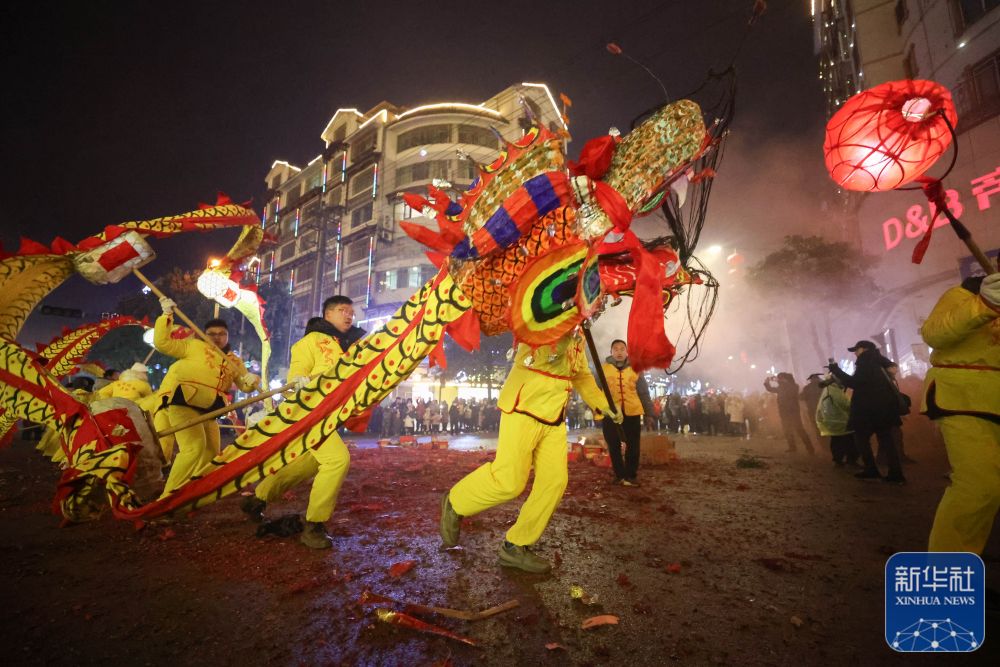 ↑2月23日,人们在贵州省黔东南苗族侗族自治州丹寨县城进行舞龙表演。新华社发(杨武魁 摄)