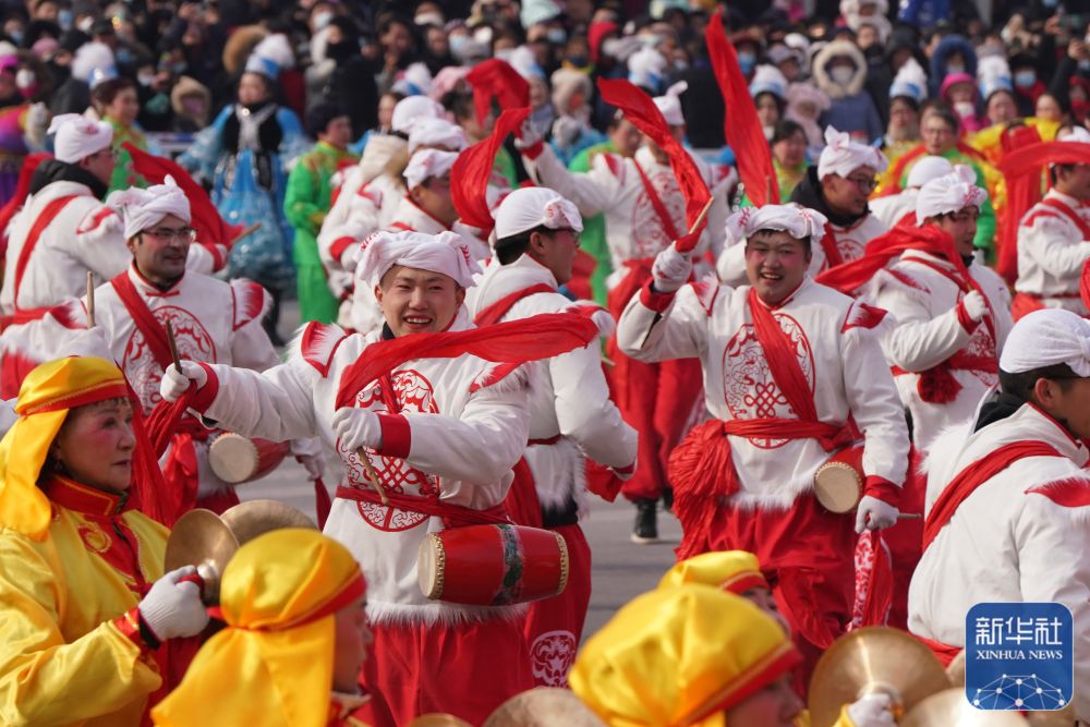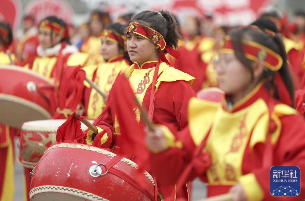 ↑2月24日,在新疆昌吉市,社火队员表演腰鼓。新华社记者 张啸诚 摄