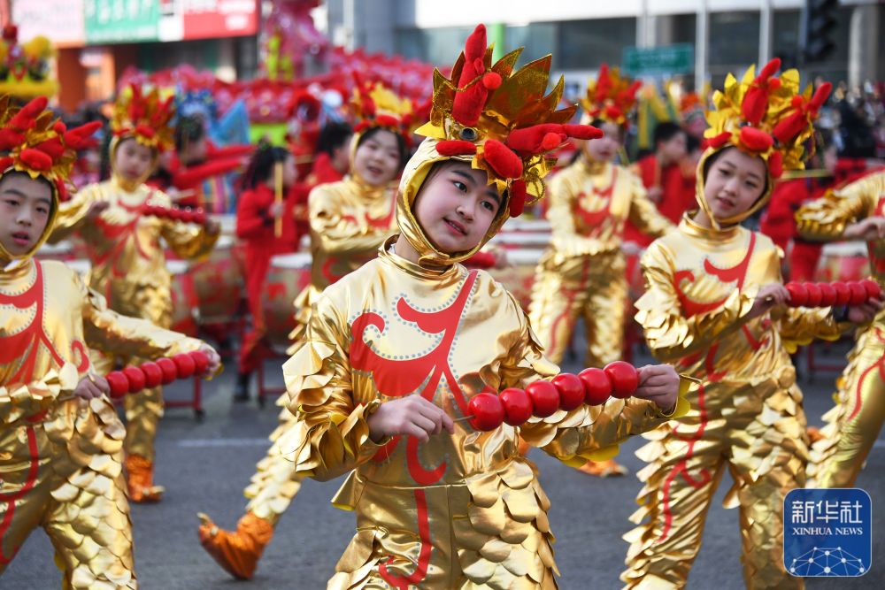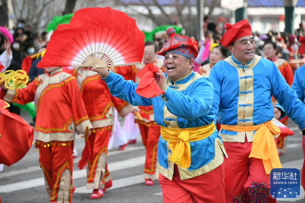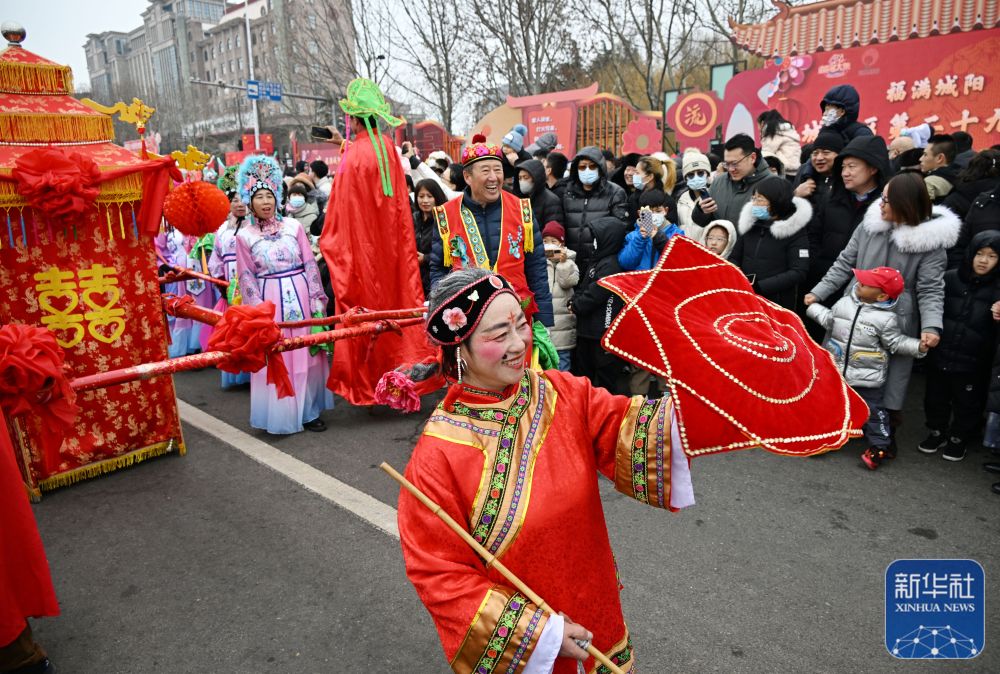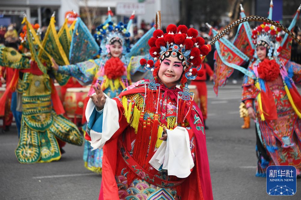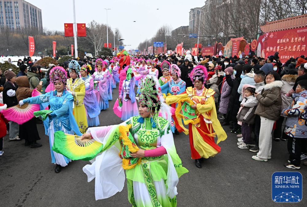 ↑2月24日,演员在山东青岛城阳第二十九届民间艺术节上巡游表演。新华社记者 李紫恒 摄