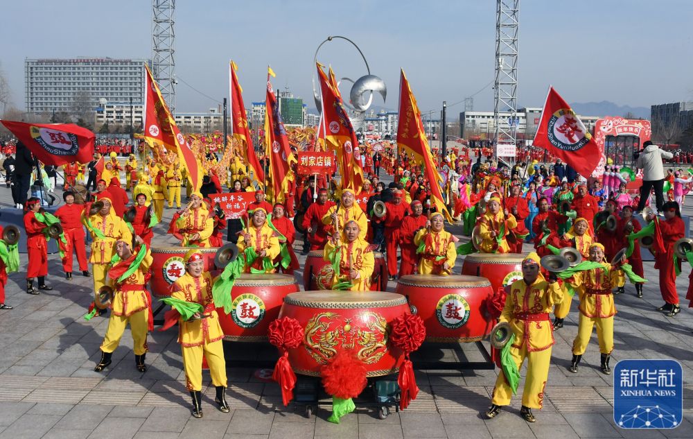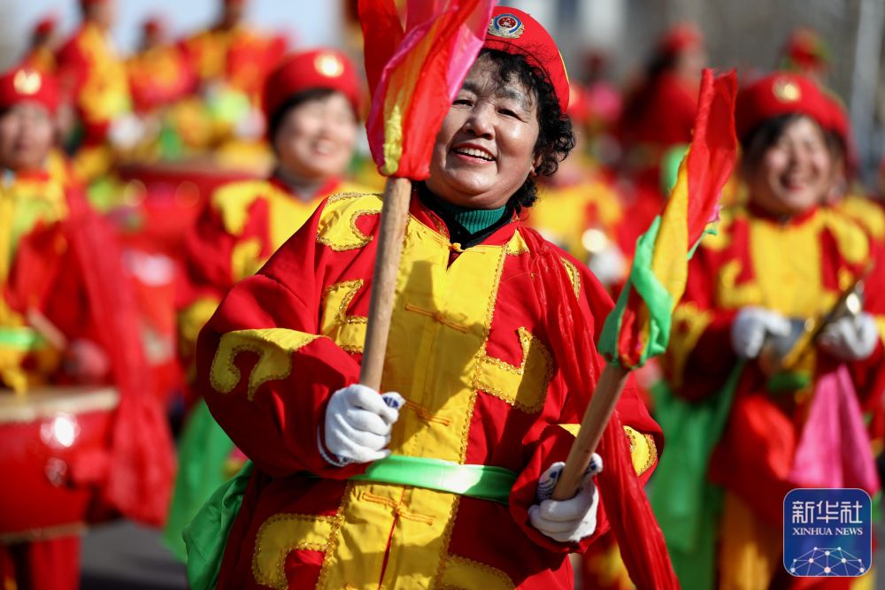 ↑2月23日,在山东省淄博市周村区,女子队在表演喜庆大鼓。新华社发(高发芳摄)