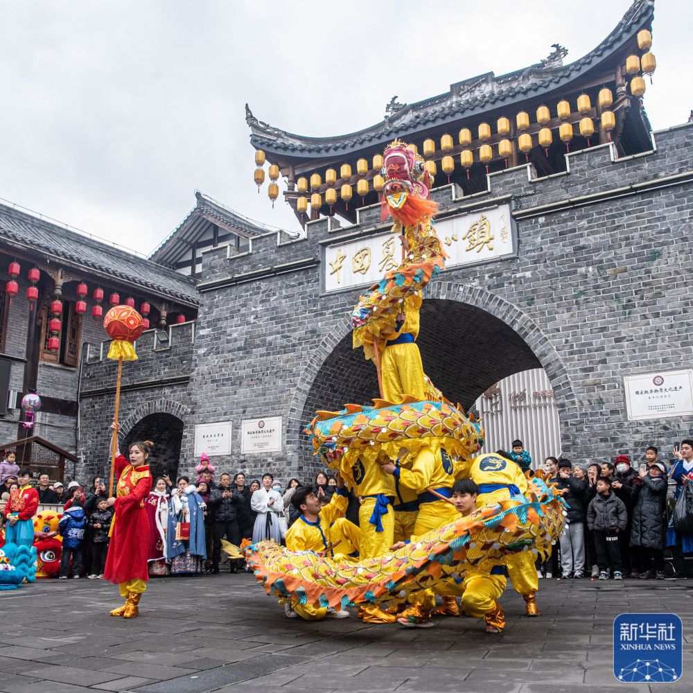 ↑2月24日,舞龙队在重庆市荣昌区夏布小镇“千年荣昌 喜乐元宵”2024年系列元宵节民俗文化活动上表演节目。新华社记者 唐奕 摄