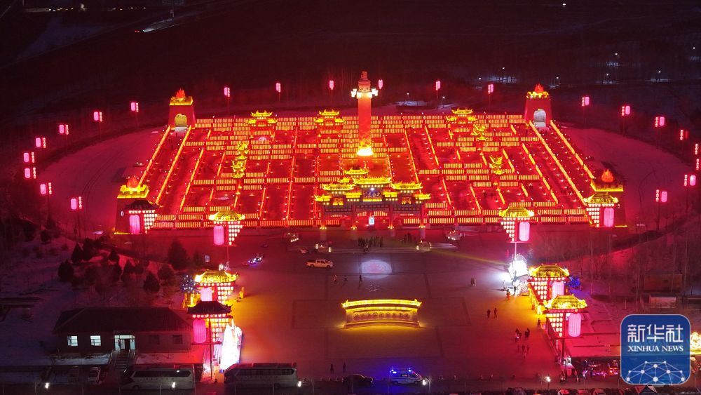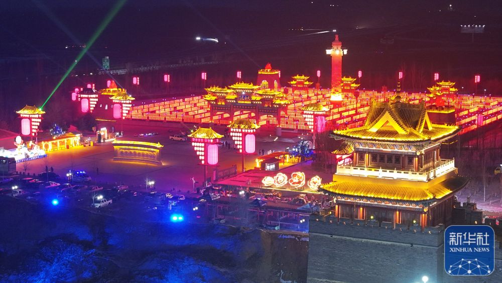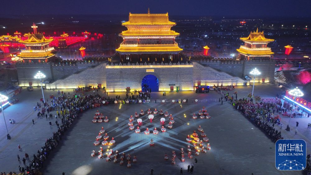 ↑这是2月23日在盐池县长城关拍摄的元宵节社火展演(无人机照片)。新华社记者 王鹏 摄