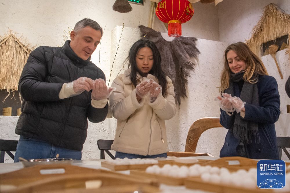 ↑2月24日,外国友人在重庆市荣昌区夏布小镇“千年荣昌 喜乐元宵”2024年系列元宵节民俗文化活动上包汤圆。新华社记者 唐奕 摄