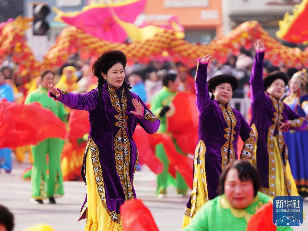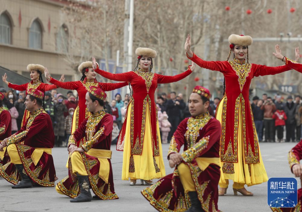 ↑2月24日,在新疆昌吉市,社火队员进行民族舞蹈表演。新华社记者 张啸诚 摄