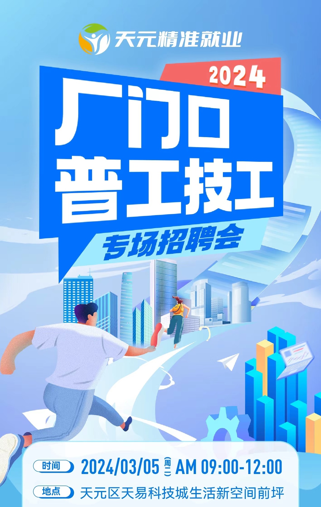 湖南日报·新湖南客户端2月29日讯(通讯员 张弥郁)为满足区内企业用工需求,搭建广大劳动者及重点群体求职平台,方便返乡居民就近就业,扩宽求职者就业渠道,3月5日,将开展天元区“厂门口”招聘会,让就业服务进园区,把招聘岗位送到家,为株洲市天元区普工、技工类等求职者提供精准就业服务。需要找工作的居民,千万不要错过哦!