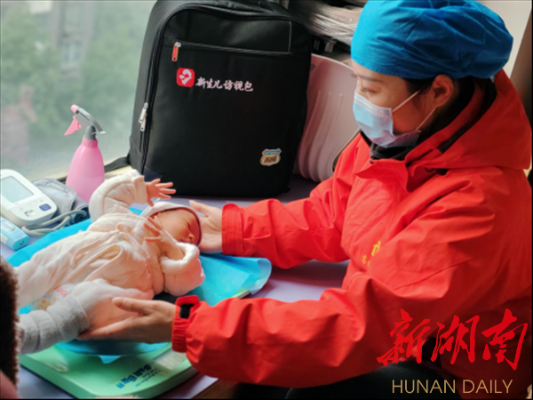 新湖南客户端2月21日讯 (通讯员 邓芳芳)2月19日,大年初十,家住雨花区高桥街道怡园社区的胡女士家中来了一位特殊的访客。只见她从随身的背包中掏出便携体重秤、血压计等,边操作边和胡女士交流:“宝宝体重3.2公斤,黄疸指数正常……你这几天睡眠情况如何,母乳喂养是否顺利……”这是怎么回事呢?原来,是雨花区高桥街道社区卫生服务中心妇幼保健专干李海霞,按照约好的时间上门为胡女士和她刚出生5天的宝宝进行产后访视。