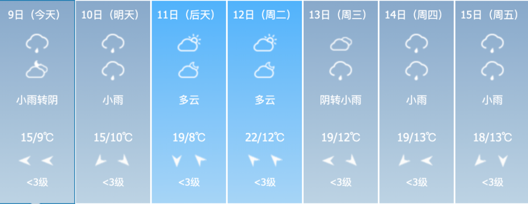 今天阴天有阵雨,气温7~14℃;持续到10日,多阵雨;11日到12日白天多云到晴天;13日晚到15日降水再度发展。