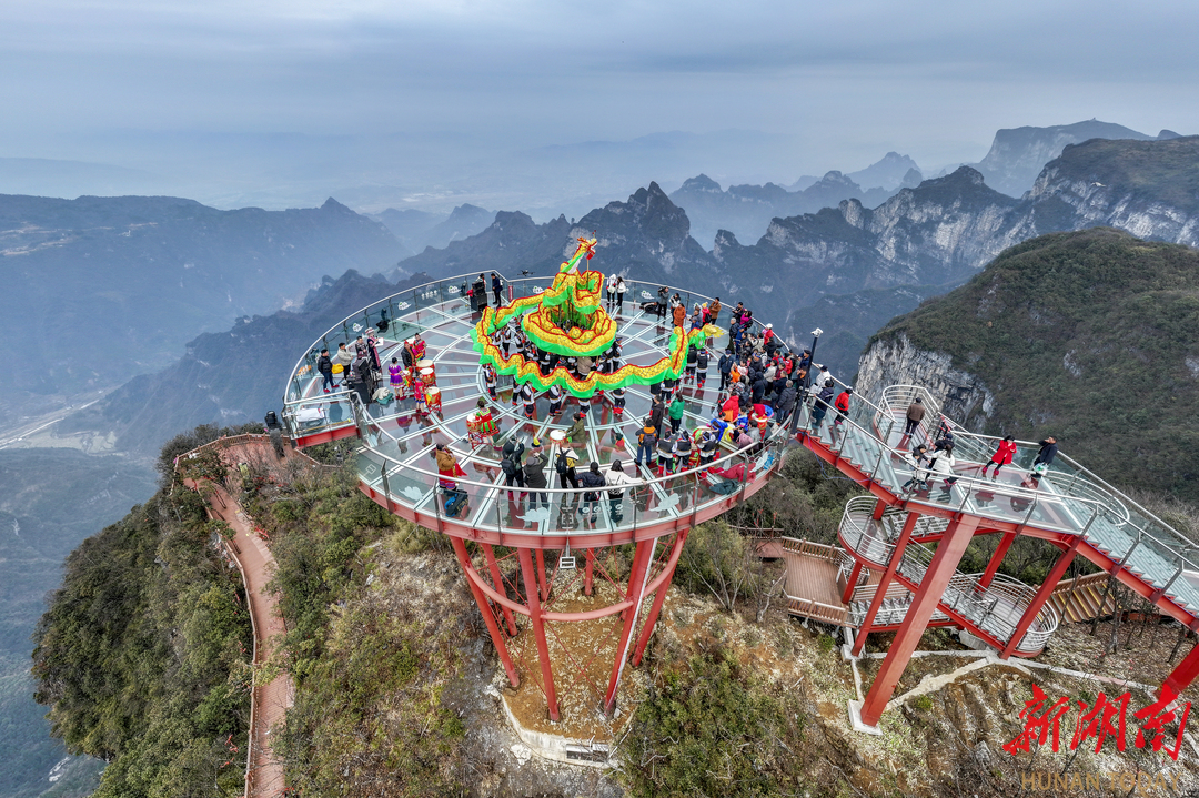 3月10日,张家界七星山景区,民间艺人在海拔1520的“天空之眼”观景台进行舞龙表演。