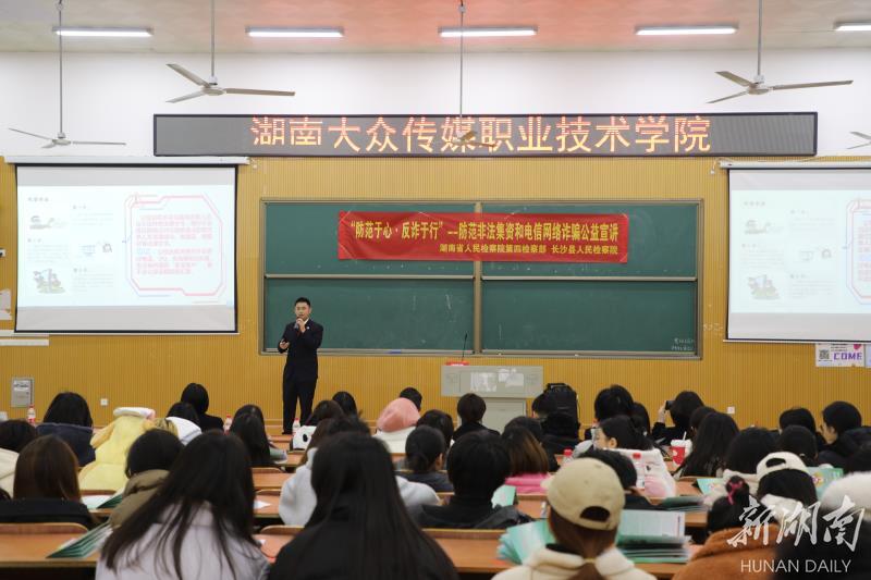 △2023年12月26日,“星检说”普法团走进湖南大众传媒职业技术学院,讲授防范非法集资和电信网络诈骗普法课。