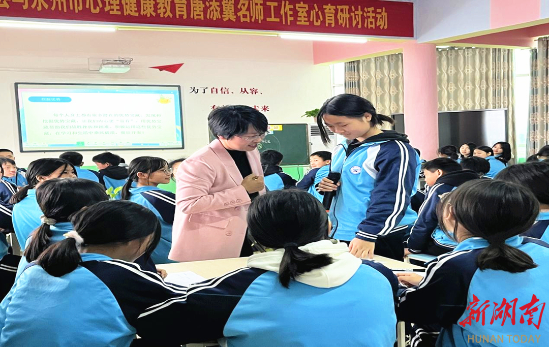 随后,工作室组织学习研讨活动,道县第六中学马巧霖上了一堂生动的心育研讨课《我的优势宝藏》。研讨课后,唐添翼进行精彩的点评,并就如何有效开展中小学心育课程作了详细指导,为教师们开展心育工作指引了方向。听课教师分享了自己的听课感受,共同交流心育教学的工作经验和方法。