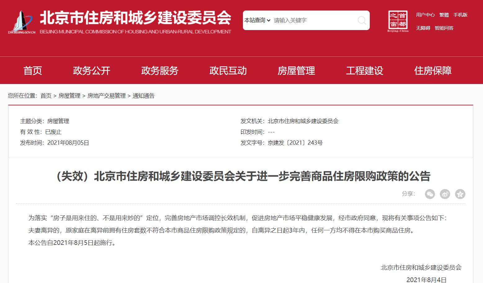 据北京市住房和城乡建设委员会官网,一则于2021年发布的《北京市住房和城乡建设委员会关于进一步完善商品住房限购政策的公告》显示“已废止”。