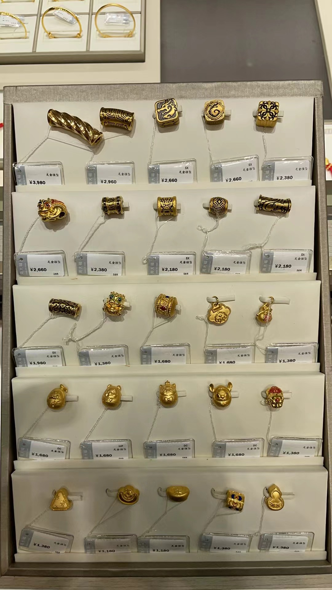 “现在购买金条和首饰的客户大概‘五五分’,春节买金条的更多,当前买首饰的客户依然更爱‘龙元素’。”该导购员说,一些克数较低的“一口价”产品颇为受捧,主要以生肖龙的转运珠和吊坠为主。