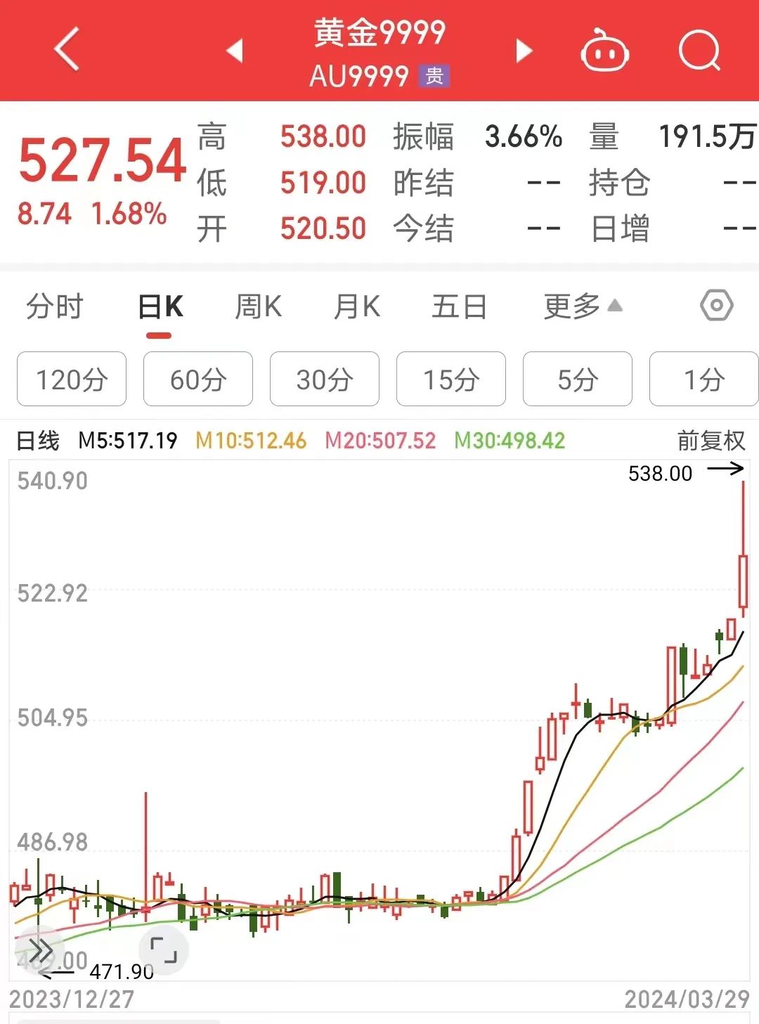 3月29日,AU9999价格再度开启“拉升”模式,盘中最高触及538元/克,每克较开盘价520.50元上涨近18元。截至目前,该品种今年以来的涨幅已达10%。