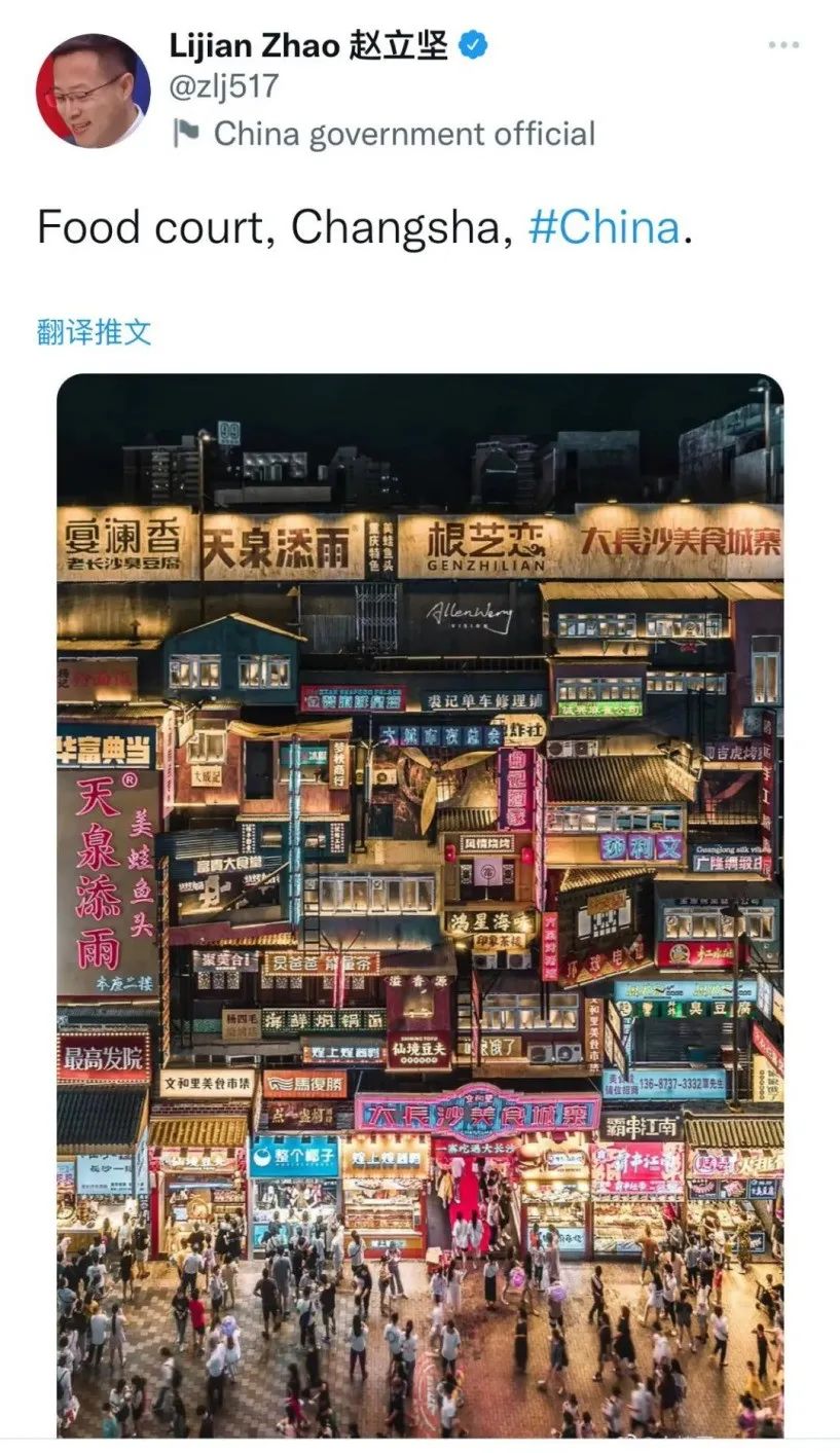 2022年6月13日,赵立坚就曾在个人社交账号上发布了一张长沙黄兴路步行街美食广场的图,并配文“Food court,Changsha,#China。”向全世界推介长沙。