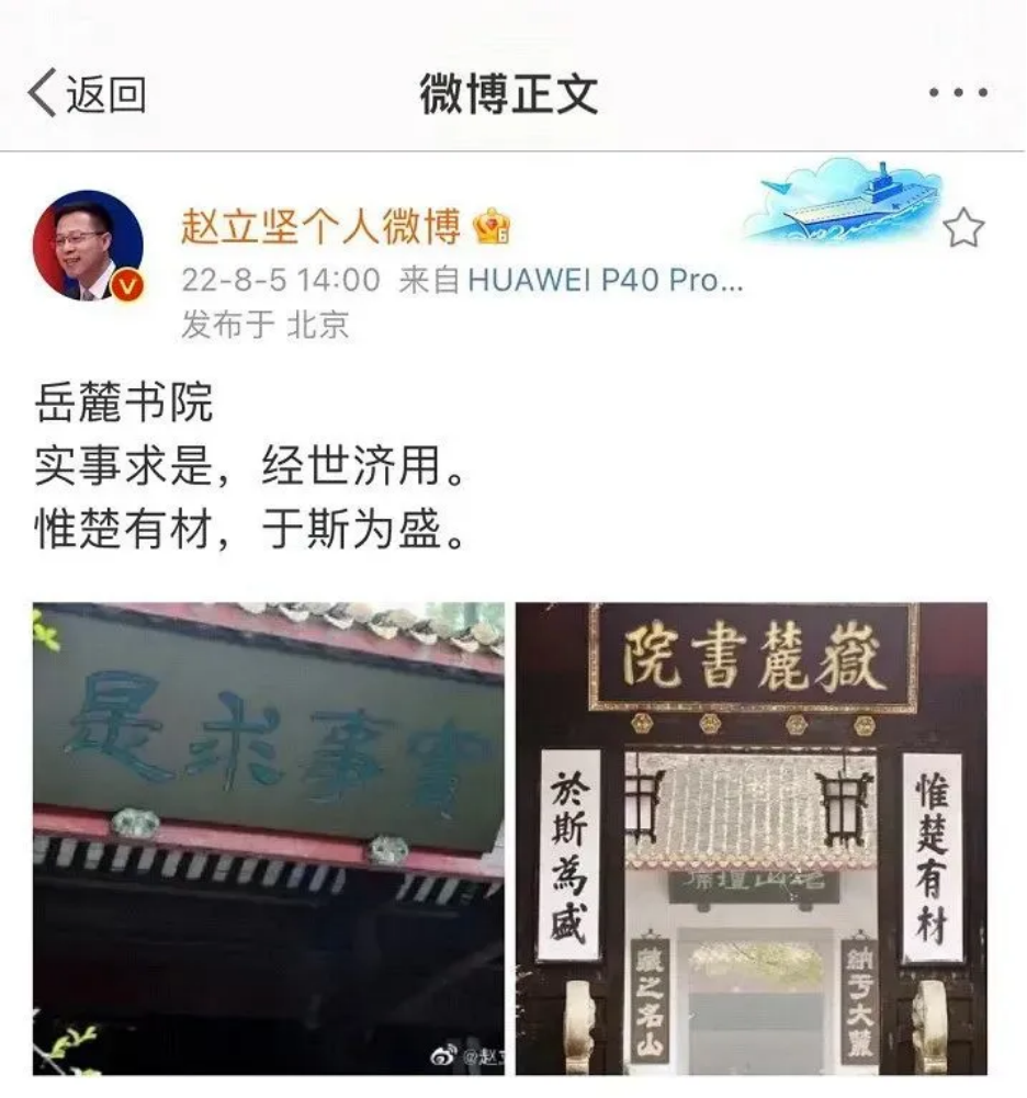 2022年,赵立坚在其微博账号发布文字并配图,向大家推荐岳麓书院。
