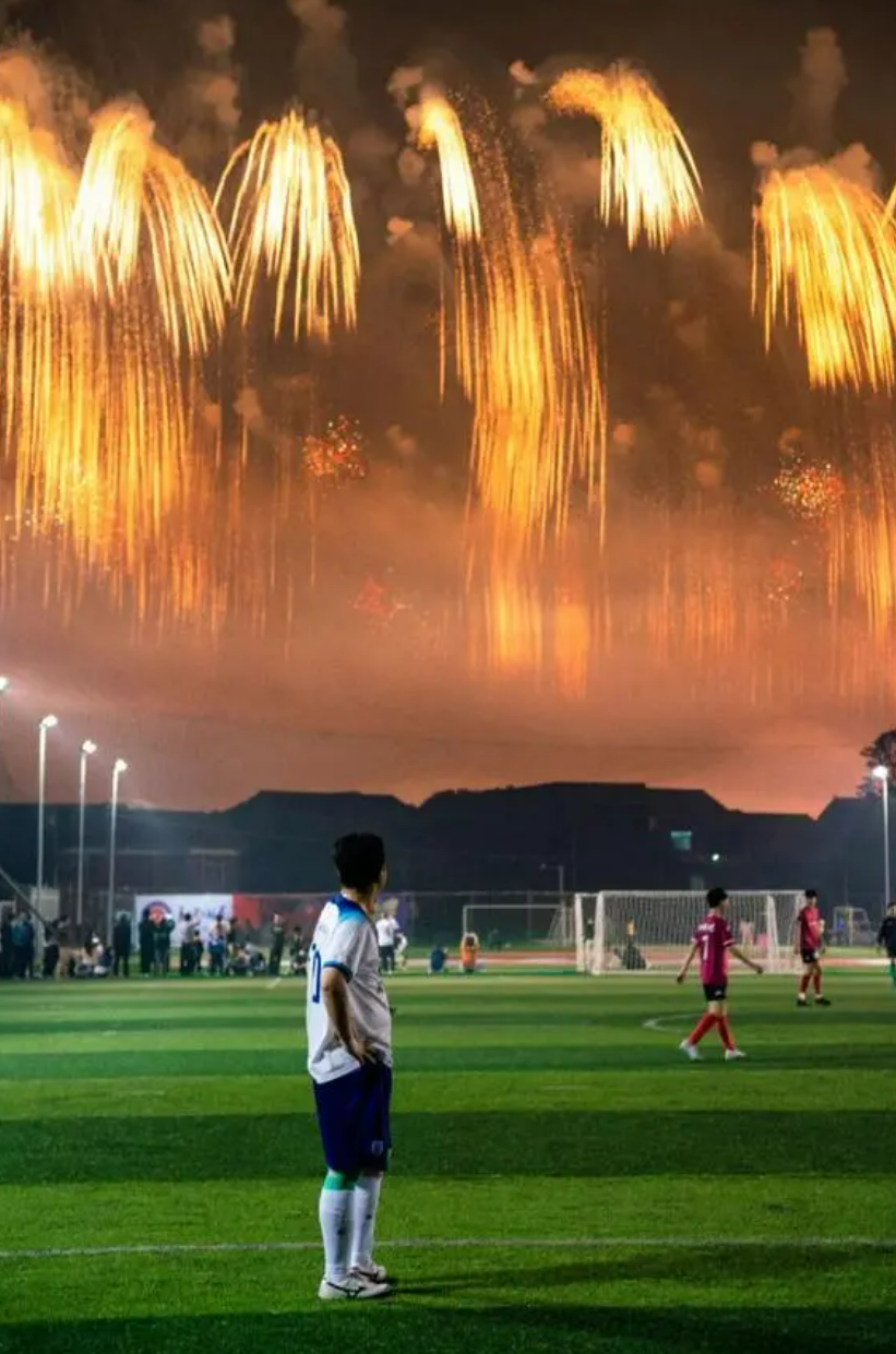 当球员们在足球场上踢球时,绚丽的烟花突然在足球场上空绽放,足球场瞬间被烟花笼罩,震撼、绝美!
