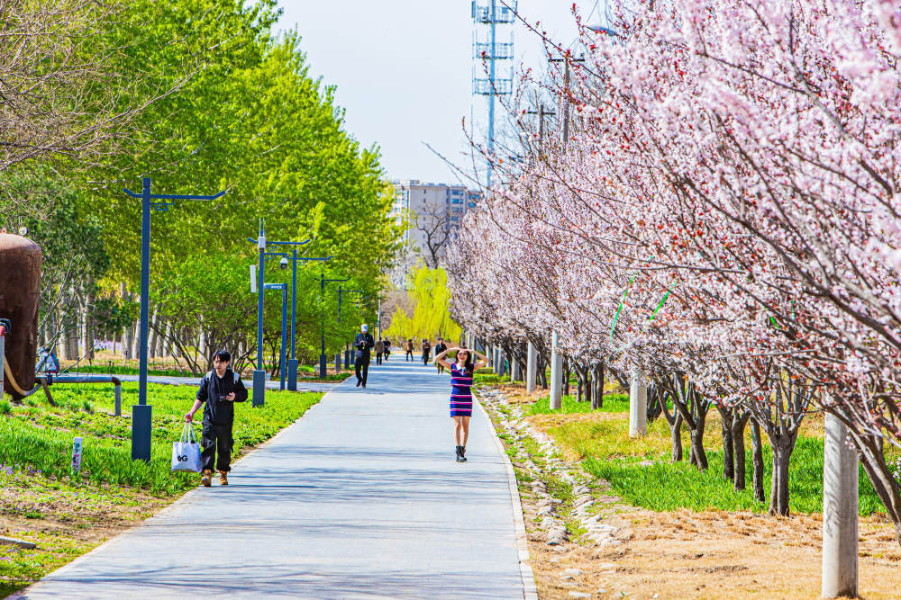 南苑森林湿地公园内春花竞相绽放,市民前来踏青赏花。