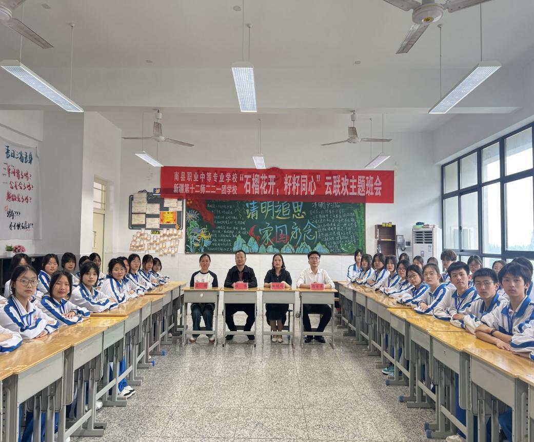 4月29日下午,为贯彻落实习近平总书记关于加强和改进民族工作的重要思想,大力开展铸牢中华民族共同体意识教育工作,共青团南县职业中等专业学校委员会组织该校2324班与结对兄弟学校——新疆吐鲁番第十二师二二一兵团学校八一班,以线上腾讯会议的形式开展了“石榴花开,籽籽同心”云联欢主题班会。