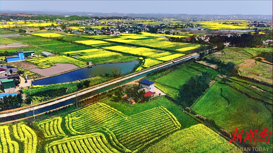 韶山灌区两岸,油菜花在阳光下迎风盛开。