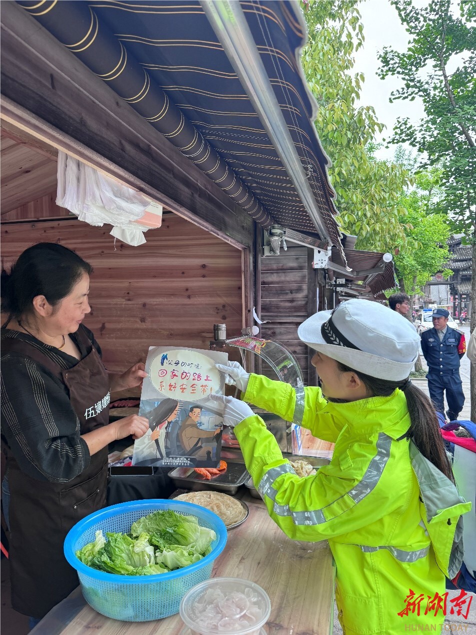 新湖南客户端5月3日讯(通讯员 张红军 石遥)随着“五一”假期来临,旅游景区迎来客流高峰。5月1日,湘西土家族苗族自治州花垣县公安局交通管理大队走进辖区边城景区,积极开展交通安全宣传活动。