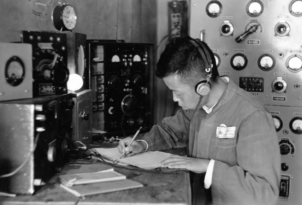 1953年拍摄的官厅水库工地上电台一角。为了保证施工的安全,在官厅水库工地上设有电台,经常和永定河上游的洋河、桑乾河及妫水河的报汛站取得联系。