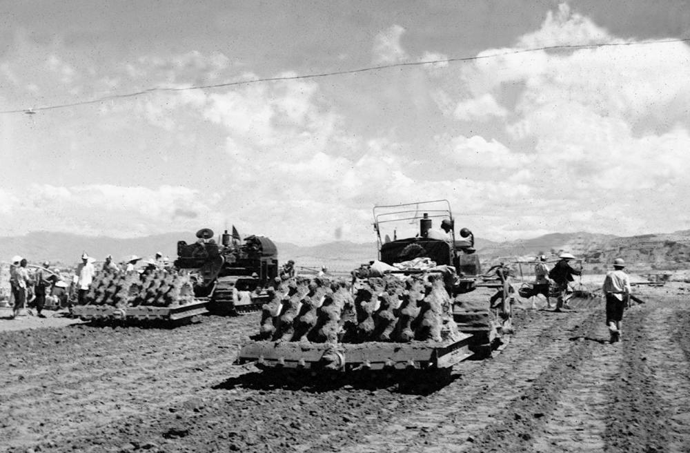 1953年,修筑官厅水库的工人们开动着羊角碾在大坝上施工作业。