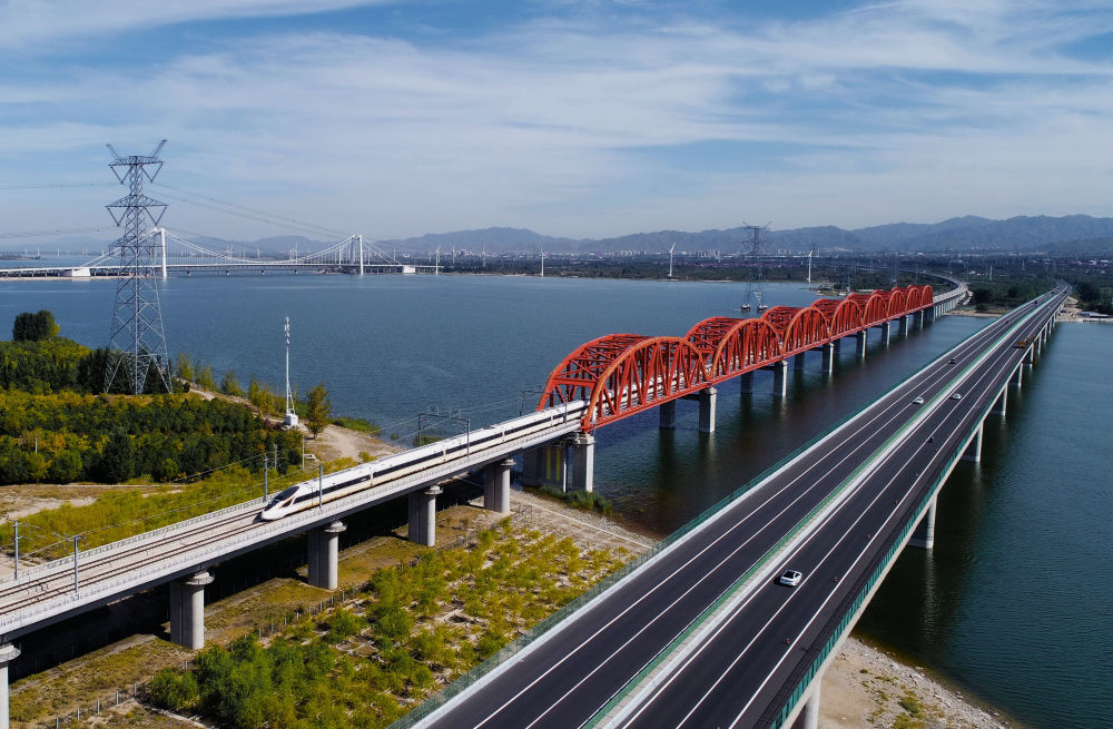 2022年9月25日,一列动车组列车从京张高铁跨官厅水库特大桥上通过。