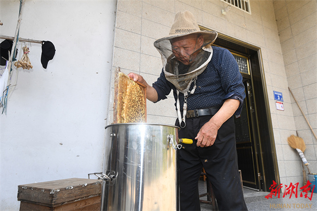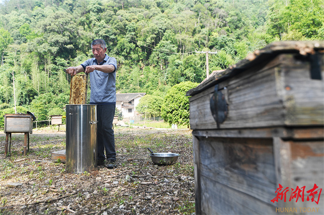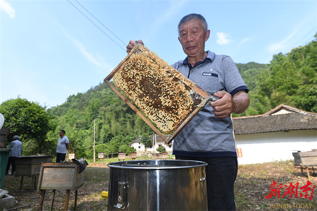 The photo shows a beekeeper taking out a beehive frame to harvest honey with a honey extractor at Tongxing Village, Daweishan Town, Liuyang City. The village has a century-old history of beekeeping. Honey production has become a cash cow for local villagers and a primary part of the village's collective economy. So far, the village is home to more than 90 beekeepers, with an annual output of honey reaching 75,000 kg. (Photo/Tian Chao and Wang Wen, Hunan Daily)