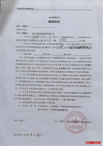 之后,在警方的介入下,长沙仟那公司付清了拖欠的租金,但前提是业主要在解约协议上签字。