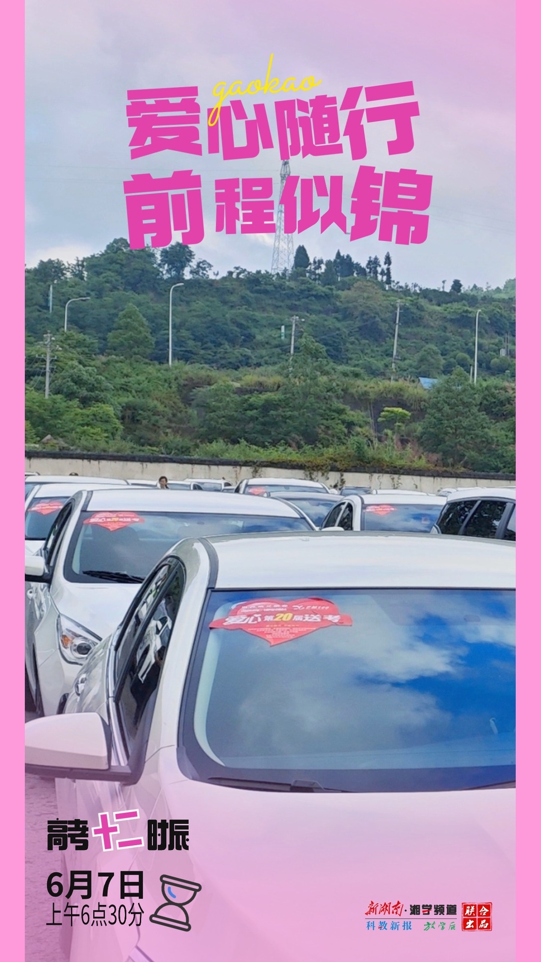 6月7日上午6点30分,湘西土家族苗族自治州爱心送考车队集结完毕,整装待发,每辆车贴有醒目爱心送考车标,免费为学生提供送考服务。彭博/摄