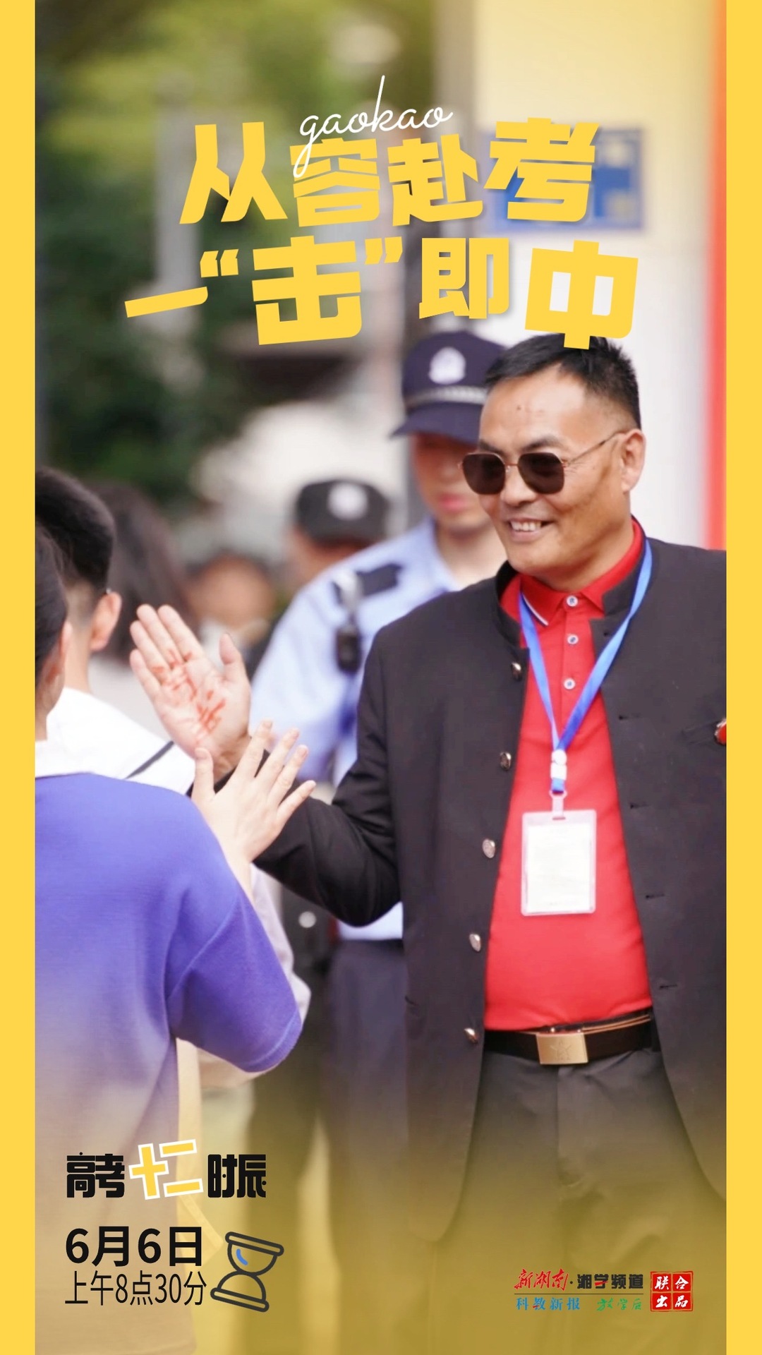 6月7日早上8点30分,长沙市一中考点,考生陆续进入考场,考点保卫科工作人员在手心写上“加油”二字,和每一位考生击掌,传递祝福,祝愿考生首考顺利,一击即中。