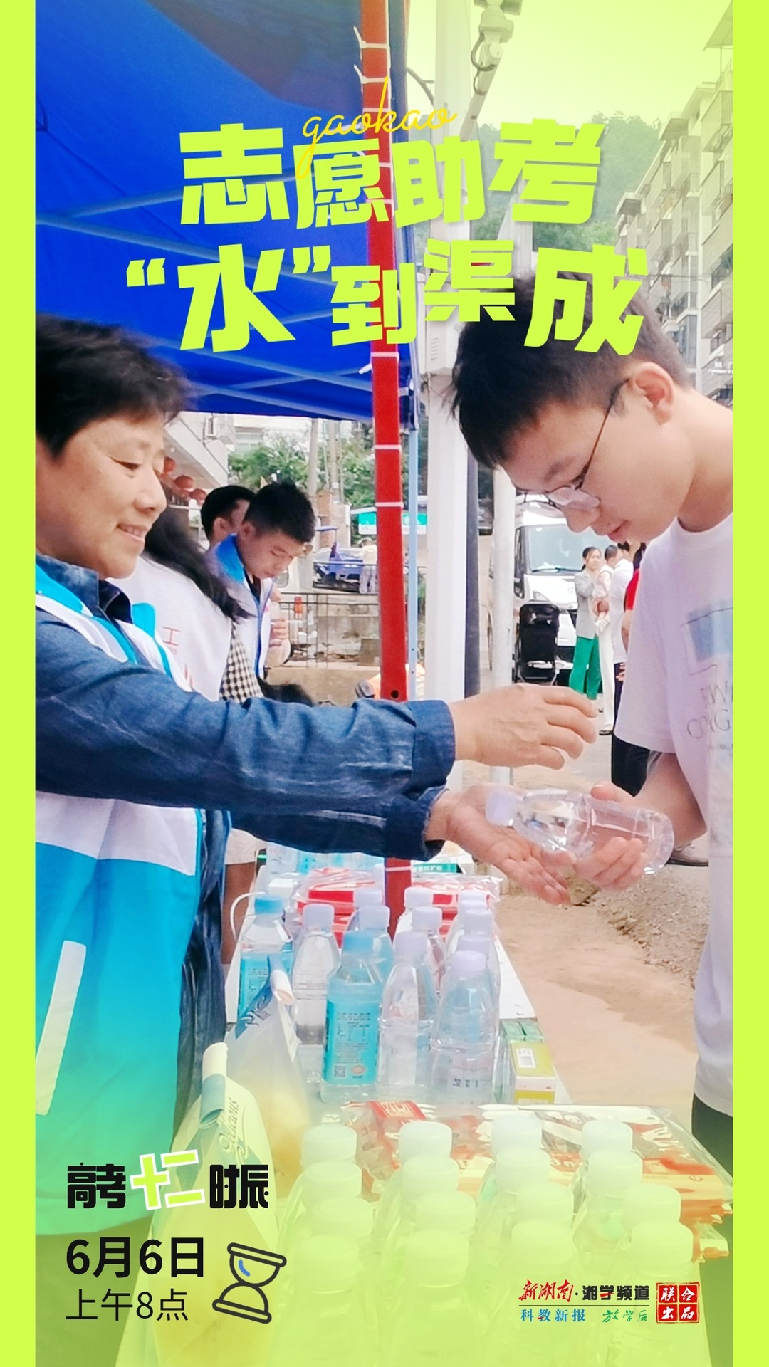 6月7日上午8点,双牌县第一中学考点外,爱心志愿者将一瓶瓶汇集了期盼与祝福的矿泉水送到考生手中,祝愿他们考试顺利,水到渠成。盘海军/摄