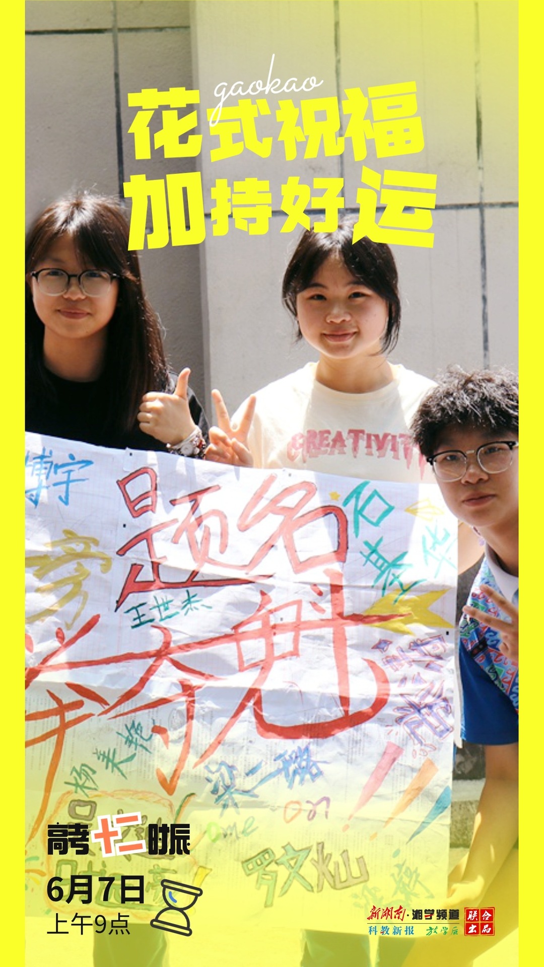 6月7日上午9点,吉首市民族中学考点,高一高二的学弟学妹用手绘海报给高三考生画出美好祝愿。向金美/摄