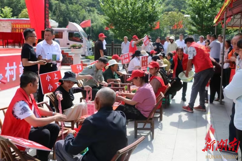 活动吸引了众多村民参与并亲自上手体验,网红团队加入到活动策划和直播中,民间艺术团进行助兴演出,轻松趣味的活动引来阵阵笑声、喝采声。更引人瞩目的是穿插其中的法治宣传活动环节,有县司法局农村法治宣传教育月宣传团队的宣传和咨询服务、乡综治办禁毒反诈和粮食安全宣传、妇联组织的“利剑护蕾”宣传和专家团队家庭教育讲座,文艺演出间隙还安排了法治知识有奖问答环节,为踊跃竞答的村民送上实用的小奖品。同时,还就该村开展的“湘妹子能量家园”积分活动以问答的形式进行了宣传,为村民进行现场积分兑换商品。