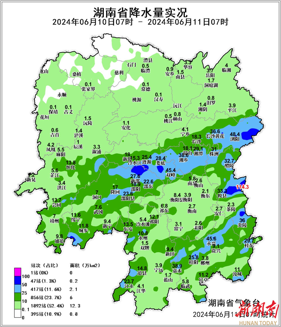 6月10日7时到11日7时,全省出现小到中雨,湘中、湘南部分地区大雨。未来三天受高空波动及中低层切变共同影响,省内大部分地区有降雨发生,湘中以南局地有暴雨,6月13日开始省内自北向南有一次较强降水过程。