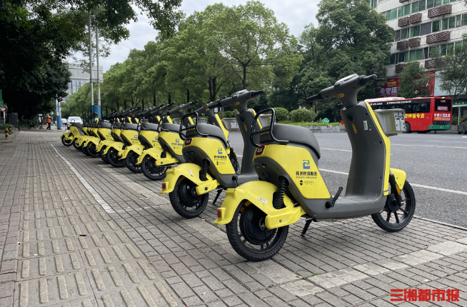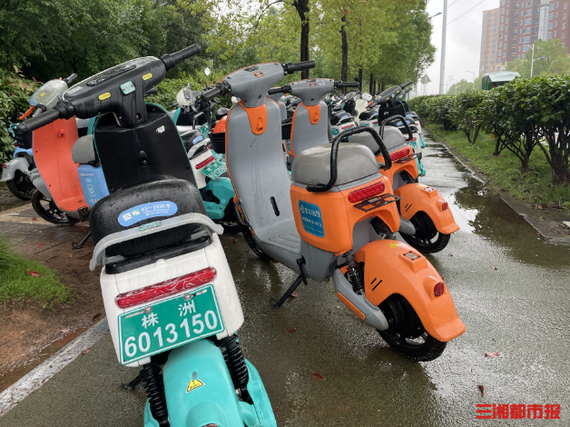 (株洲天元区嵩山路上的共享电单车全部未上牌。杨洁规摄)
