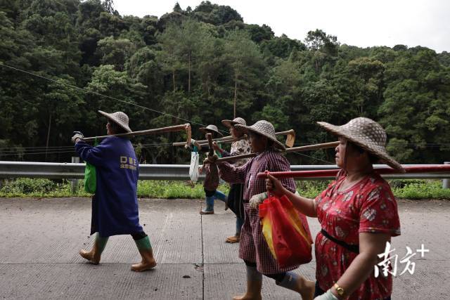 6月19日,农妇们扛起锄头往另一个救援点赶去。