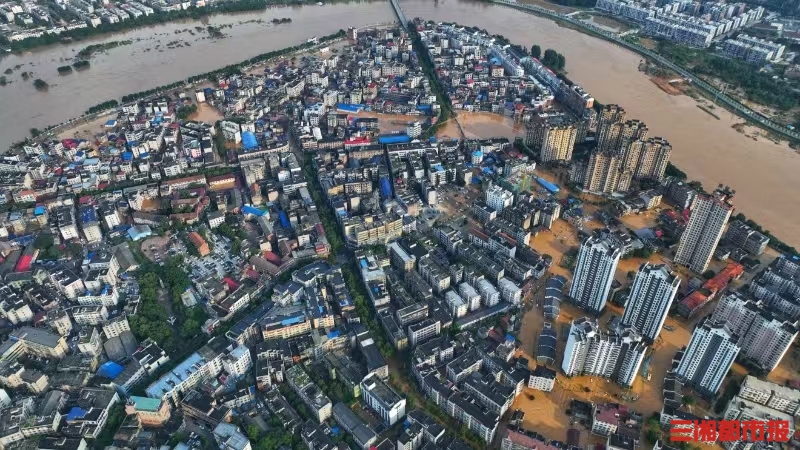 7月2日下午,岳阳平江放晴。航拍可见城区仍存多处内涝,目前武警、消防及蓝天救援队等各方救援力量正开展救援。平江,挺住!(全媒体记者 张浩 顾荣 王珏)