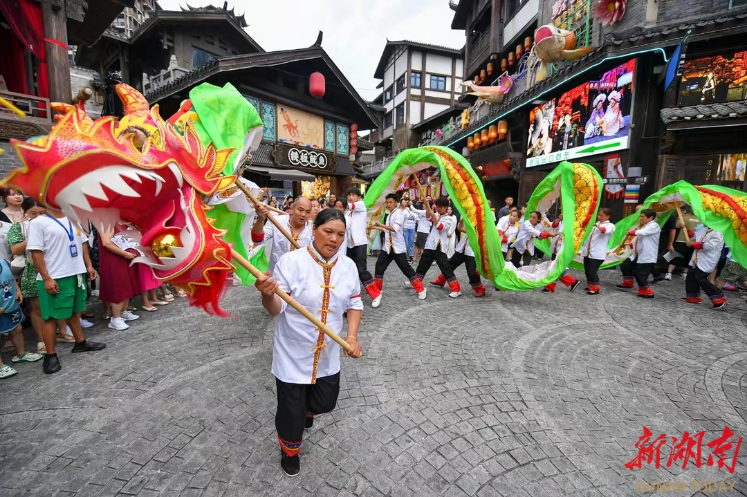 活动现场,人头攒动,热闹非凡。金、木、水、火、土,“五行龙”轮番上演,土家镇山鼓、茅古斯、土家山歌、傩面舞、古彩戏法及八宝铜铃舞等诸多精彩非遗,让观众们大饱眼福、流连忘返。