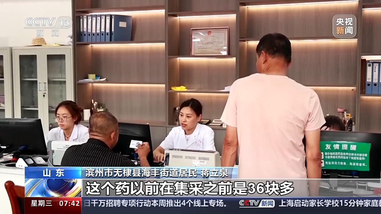 山东省滨州市无棣县海丰街道居民 蒋立泉:这个药在集采之前是36块多,从集采之后这个药是4.5元,报销之后才仅仅9毛钱,一年总费用才30多块钱。